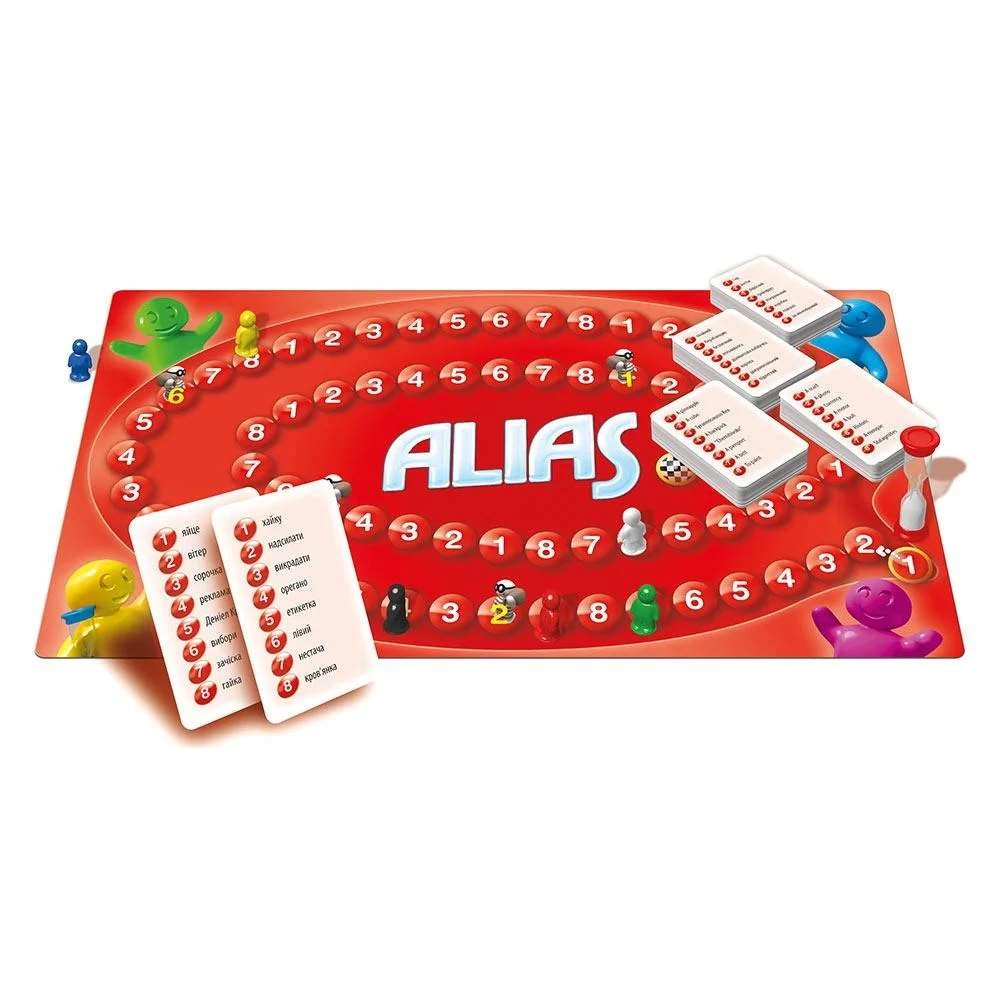 Гра Alias складається з багатьох карток, кожна з яких має 6 слів. Кожне слово має номер від 1 до 6. Слова різноманітні - від дуже простих до дуже складних. Деякі складаються з кількох слів, що визначають одну річ (наприклад: "Срібна медаль"). Також є дошка з плитками. Кожна плитка позначена номером від 1 до 6.