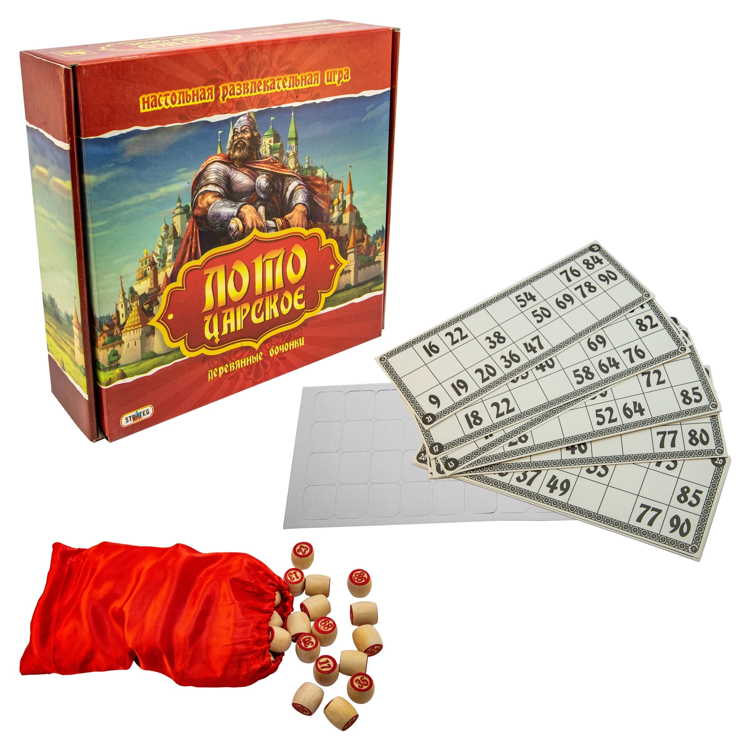 Лото "Царське" є класичною настільною грою, яка втілює в собі найкращі традиції сімейних розваг. У наборі знаходяться 24 ігрові картки, дерев'яні бочонки з цифрами, що зберігаються в мішечку, та гральні фішки, що дозволяють гравцям відмічати вибрані числа.