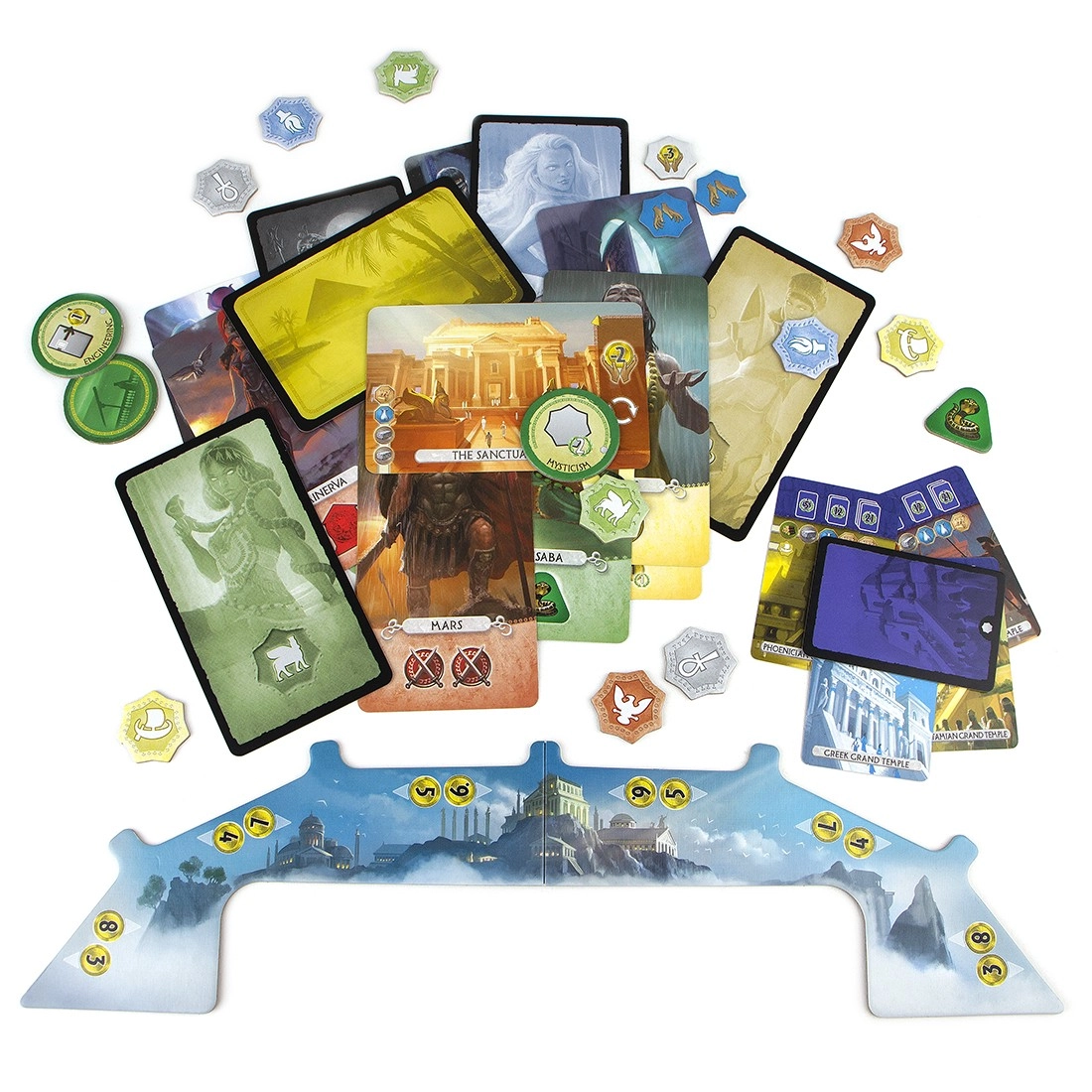 Более того, вместо того чтобы добавлять три карты гильдии в колоду для эпохи III, вы добавляете три из пяти Великих храмов. Каждый великий храм принадлежит к другой средиземноморской культуре, и если у вас есть мифологический жетон из этой культуры, вы можете построить храм бесплатно. Эти храмы стоят 5, 12 или 21 очко, в зависимости от того, сколько вы построите.
