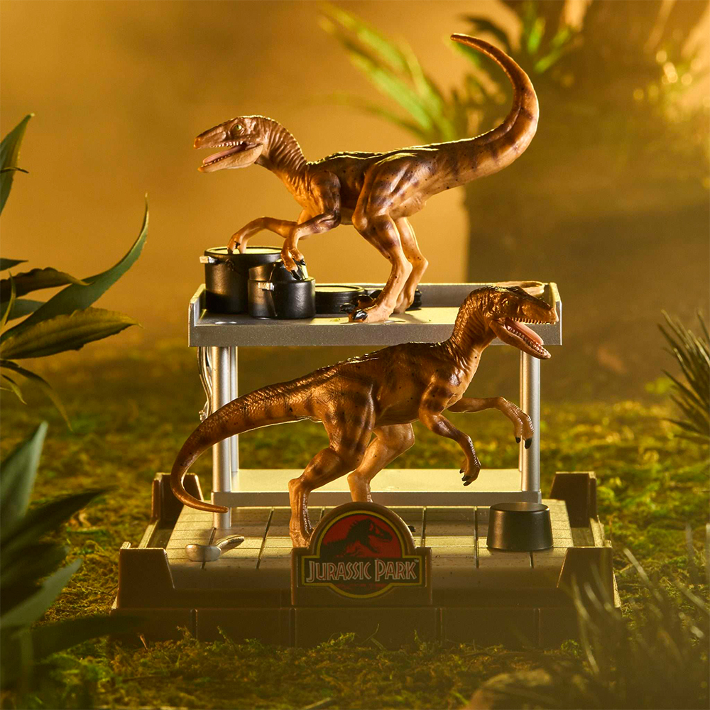 Двое велоцирапторов, преследовавших детей на кухне в «Парке Юрского периода», теперь изображены в динамической диораме. Благодаря этой сцене, передающей напряженный момент фильма, хищники останутся в ловушке – идеальный сувенир для поклонников культовой ленты.