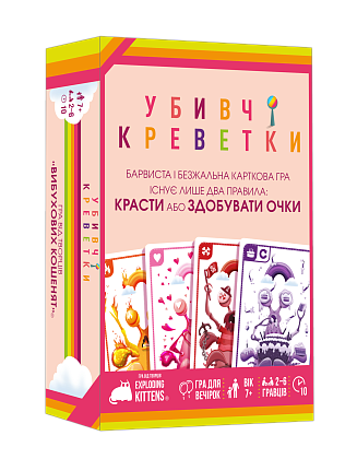 "Убийственные креветки" предлагает увлекательную игру на сбор сетов, где игроки перевоплощаются в раков-богомолов, конкурируя за доминирование в подводном мире. Ваша цель – собирать карты этих ярких существ, воровать их у соперников и зарабатывать очки путем создания мощных комбинаций. Игра приглашает к быстрым решениям и динамическому взаимодействию, делая ее идеальной для семейных игр.