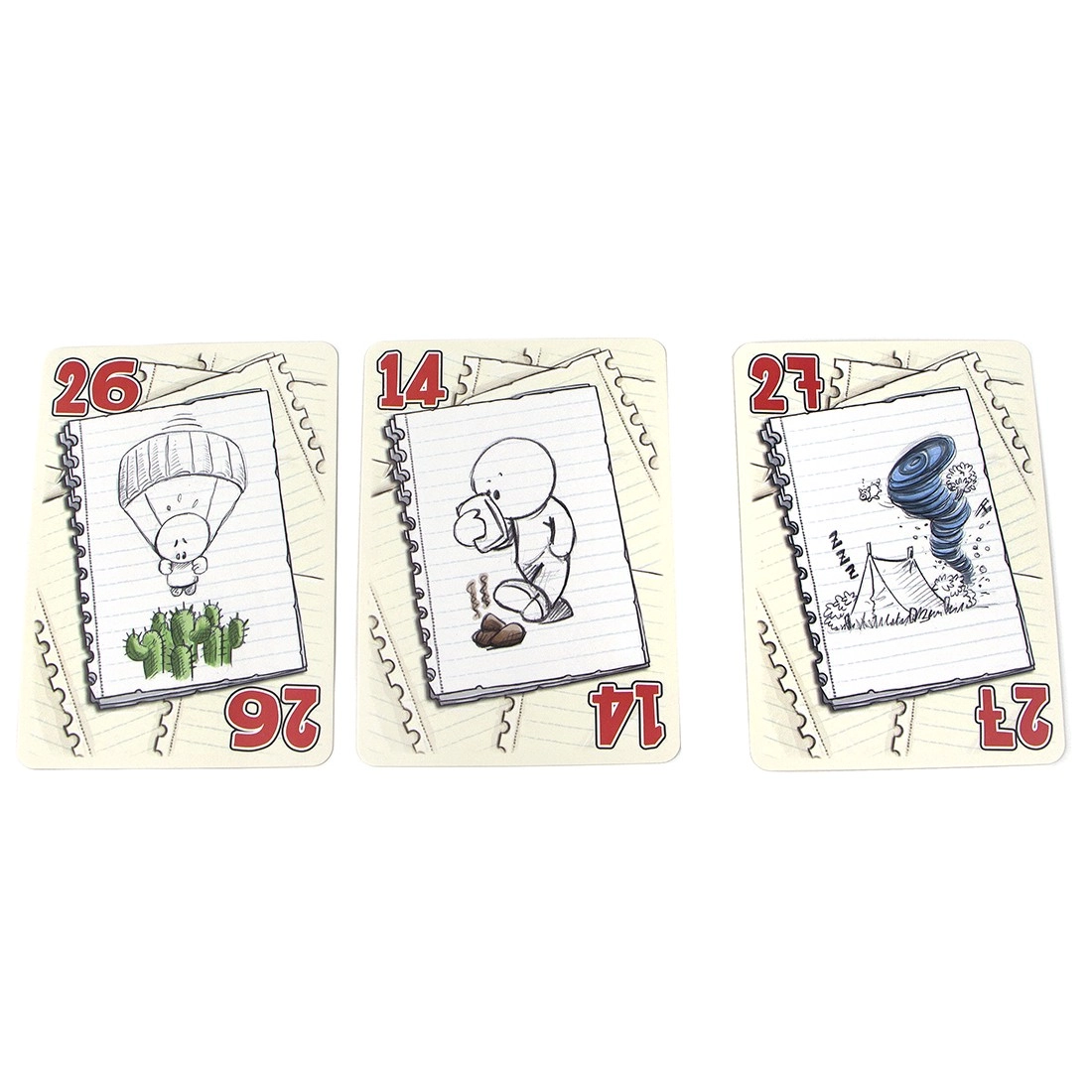 Однако выбор не так прост, поскольку игроки соревнуются за то, чтобы иметь самый низкий счет в конце игры. Колода карт пронумерована от 3 до 35, при этом каждая карта оценивается в количество очков, равное ее номиналу. Серии из двух или более карт оцениваются только по наименьшему значению в серии, но перед началом удаляются девять карт из колоды, так что будьте осторожны, ища соединяющие карты. Каждый жетон стоит -1 балл, но они могут быть еще более ценными, позволяя избежать вытягивания ненужной карты.