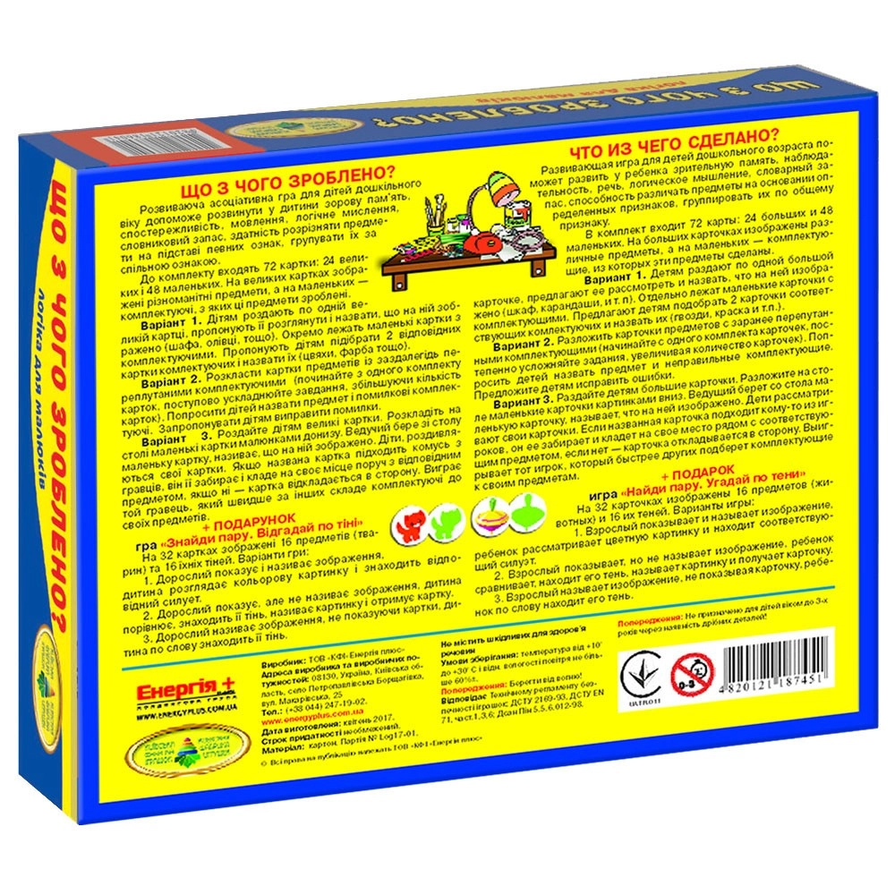 Що з чого зроблено?" — це захоплююча дидактична гра, розроблена для дошкільнят. Гра має на меті розвинути у дітей навички уважності, логіки, кмітливості, спостережливості, зорового сприйняття та асоціативного мислення. У комплект входить 32 картки, з яких 16 містять зображення різноманітних предметів, а інші 16 — відповідні їм тіні. Основна задача гравців — правильно співвіднести кожен предмет з його тінню.